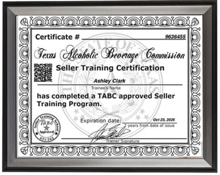 • Requirement: A TABC certificate is required to sell or serve alcohol in Texas.